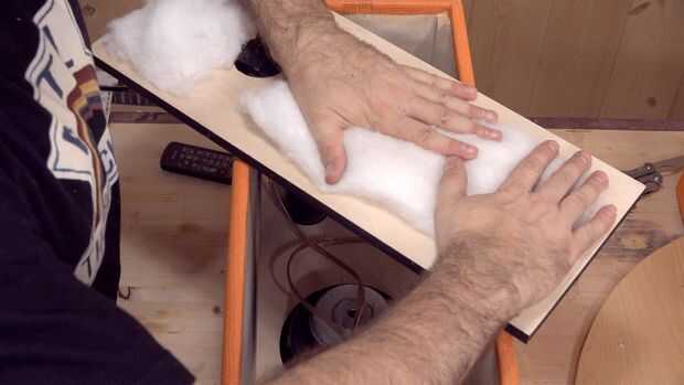 En el panel posterior te pegamento caliente algunos Poly-fil que viene con el kit. El tema de relleno de polly puede ser complejo. Sólo sé que ayuda a difundir las formas de onda dentro de la caja para un sonido mejor y más grande.