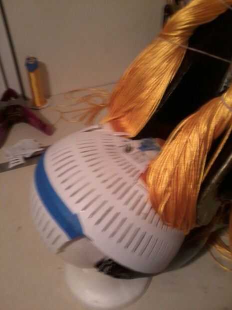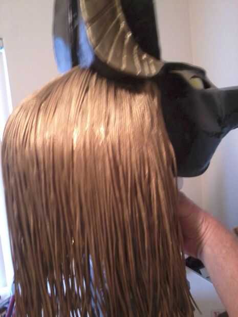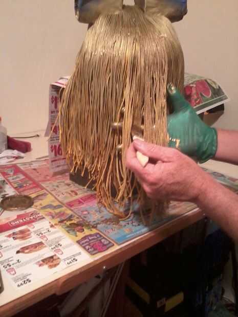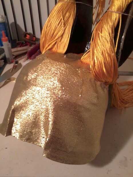 Pase el "pelo", abajo y alrededor de la cabeza en las líneas limpias y fijar con pegamento para tela, luego pintar el pelo con oro de hoja.