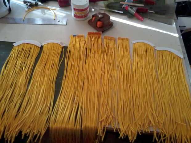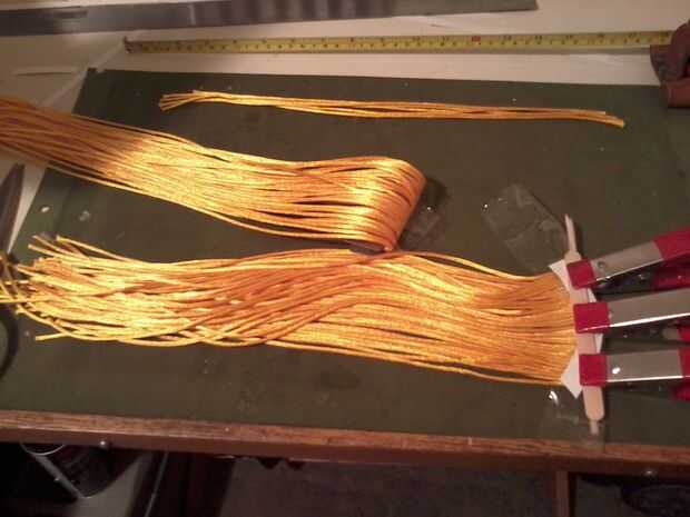 Pegamento las longitudes a un lado de papel destinado a rodar para arriba para conseguir una "curva" de donde "crece hacia fuera." Usted necesitará por lo menos 20" para los filamentos de la parte delantera de la cabeza y 14" de todas las demás. Esta máscara tiene un total de 440 filamentos (dar o tomar) :-)