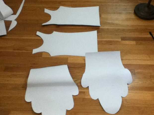 Desenrolle la espuma de EVA y aplanar hacia fuera tanto como sea posible, usar objetos pesados para mantener abajo if es necesario. Tomar los contornos de papel, orientar sobre la espuma y fíjelos a la espuma con cinta o sostenga con una mano. Trace una línea alrededor de los contornos de papel con una pluma o un marcador visible en la espuma para crear la capa base de la armadura de espuma EVA. Quitar los contornos del papel. Con unas tijeras, cortar los contornos de la espuma.