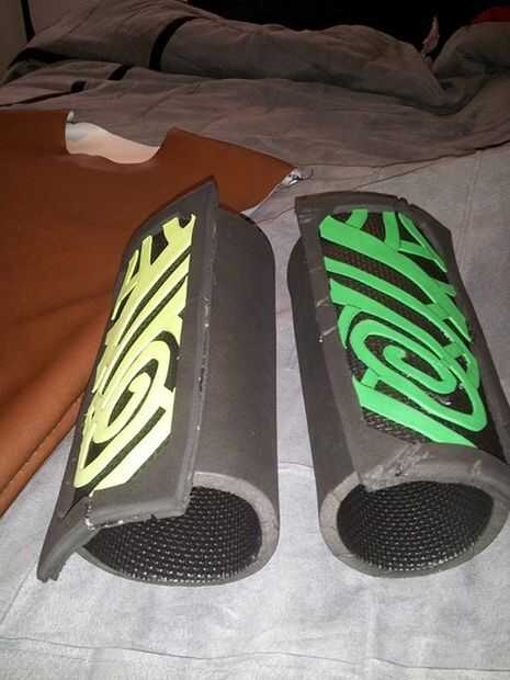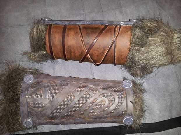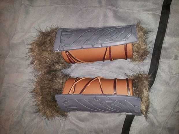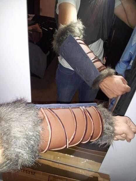 Hora de empezar en el Brazales de! deja estrella cortando la forma básica de ellos entonces cortar la espuma para darles profundidad. No recomiendo escoger hacia fuera con los dedos como yo lo hice jaja. Entonces tomé un buen rato de la espuma y corte el trabajo de desplazamiento en él y luego lo pegan en su lugar. Luego lo hice todo otra vez para el otro que también hizo lo mismo para la armadura de la mano. Una vez las armaduras hechas donde yo quería haber crestas guantes pero en el juego hay cuero, por lo que se me ocurrió esta idea para hacer un tubo de espuma de EVA y luego cubrirla con el falso cuero había. Una vez que los brazales que terminó fue tiempo para la pintura. Yo entonces cubierto les en plasti dip antes de la pintura que llena en todos los agujeros pequeños de la espuma. Después de todo que es el tiempo para todos ellos pelaje encima y curtida fuera.