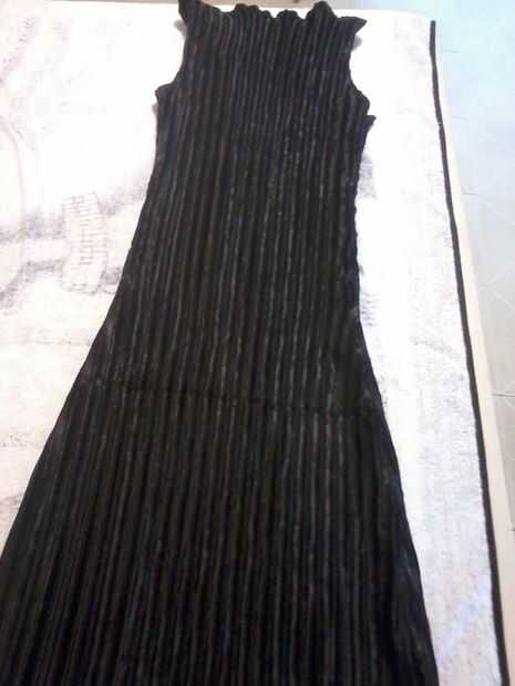 Para el vestido, mi mujer utiliza un vestido de noche como el "patrón" para el vestido. Este material es a diferencia de lo que hemos visto, tiene un patrón plisado cuadrado que se extiende casi 4 veces su unstretched ancho.