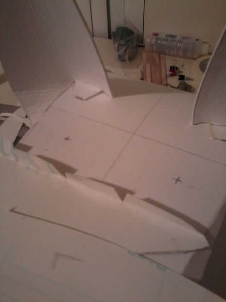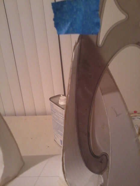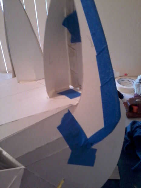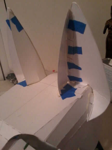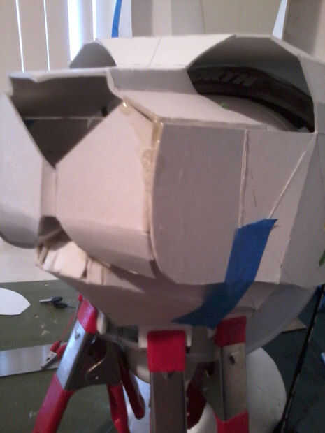 Todavía debe tener las piezas para los oídos, pero las cosas pueden haber cambiado un poco con la placa mate (o usted puede cambiar de opinión, como lo hice). Continuar experimentando con el papel hasta las orejas derecha, y pegamento, les mantiene en su lugar con cinta de enmascarar hasta que el pegamento se seca. Usted puede utilizar pedazos de papel aquí para reducir el peso, pero puede usar tablero mate si quiere. El papel es más fácil trabajar.