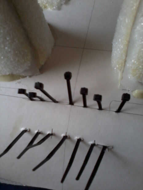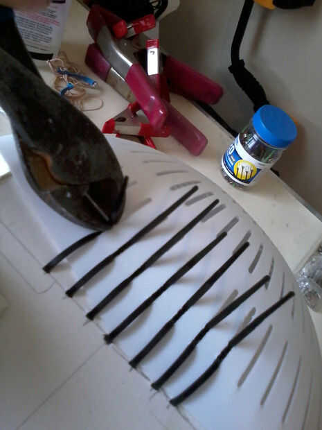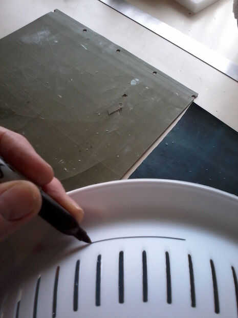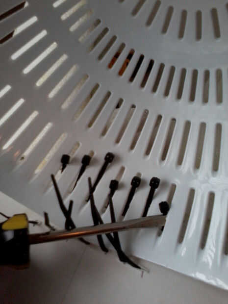 Cortar los pies y el borde del colador, luego cuidadosamente perforar 2 filas de 7 agujeros en la parte posterior de la máscara con el cuchillo. Hilo de rosca zip lazos a través de los orificios por lo que es una "bisagra" en la parte posterior de la cabeza, permitiendo al usuario obtener y de la máscara, preservando la ronda detrás de la cabeza.