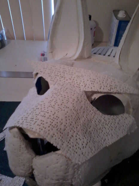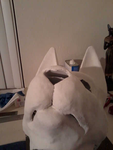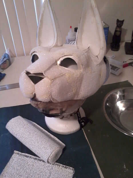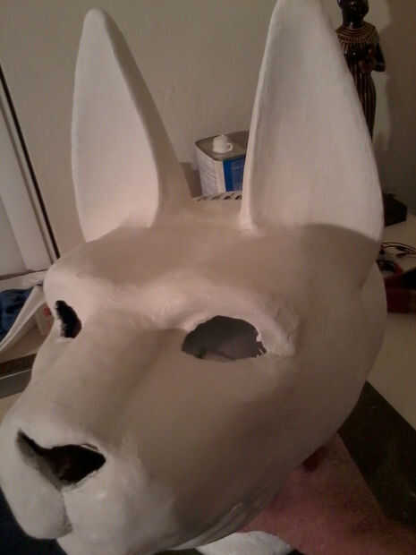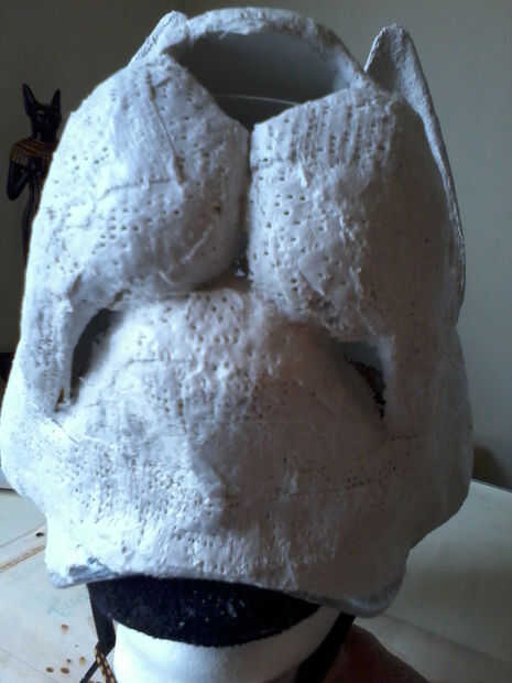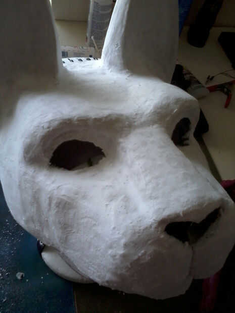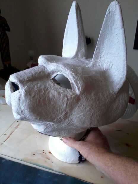 Cuando esté seca, cubrir la máscara toda en material de masilla o plaste de pasatiempo liviano. Deje que se seque, luego arena suave. Poner una ligera capa de masilla en los oídos, entonces ya está casi seco, utiliza una herramienta de talla o algún otro instrumento a los oídos de la raya.