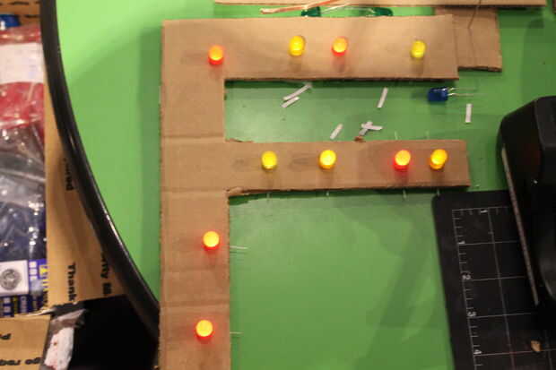 Para hacer que las luces encienden, se utilizaron dos pilas de moneda. También hemos creado una batería de 'bolsa' que nadie podría cambiar fácilmente (como un interruptor), ayudarnos a activar/vuelta en el circuito cuando queríamos trabajar.