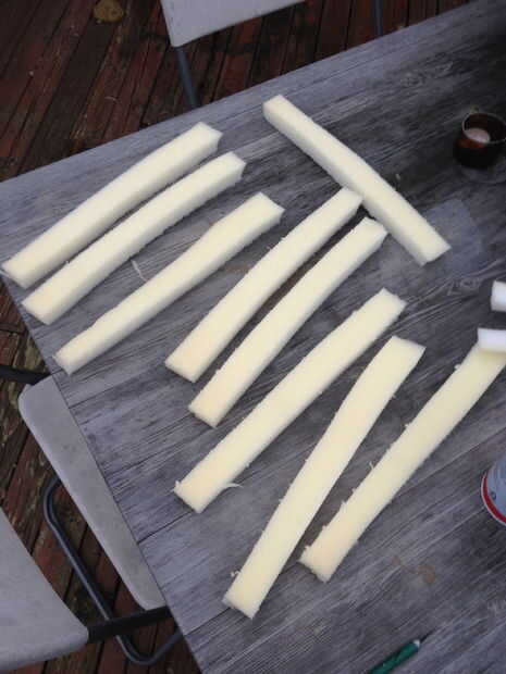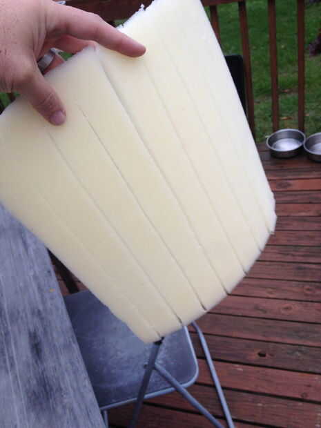 Primero tomé una de mis hojas restantes que encajaría bien dentro del lado de la caja y luego anotó o corte 3/4 a través de la espuma con un cuchillo del exacto como usted puede ver en la primera foto. Lo hice así para que puedas todavía fácil aerosol toda la hoja con pegamento y luego separar en tiras versos que rociarlas individualmente y haciendo un lío pegajoso por todas partes. Hice mis tiras de 1 pulgada de ancho y 9-10 pulgadas de largo por lo que fácilmente se encajaría dentro de la caja sin obstruir cualquier cosa. Después de anotó corte por lo que pude ver cuántos sería obtener de cada hoja separaba completamente con mi cuchillo del exacto. A continuación, a partir de un lado de la caja uniformemente espaciados y aplicar las tiras. Me comenzó con la tira media luego repetido boquete de 1 pulgada, entonces 1 pulgada de espuma hasta que tuve cinco en todos los lados excepto en la parte delantera. Esta área que se deja en blanco por lo que es fácil ver hacia fuera.