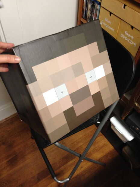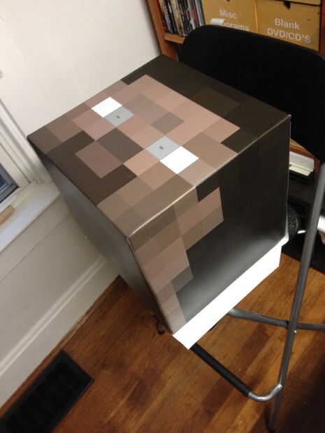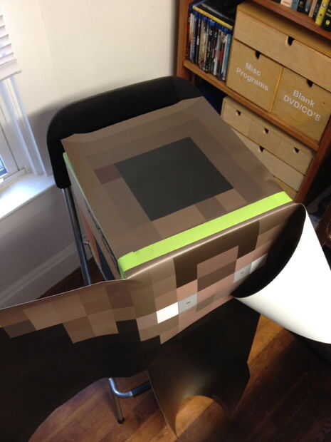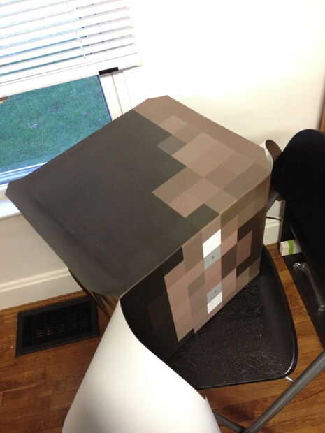 Desnudo conmigo en este paso puede resultar un poco confusa pero haré mi mejor para explicar profondo. Buscar notas en las fotos para explicar cuál es mostrado. Así como mencioné en un anterior paso mi piel de Steve para la cabeza realmente se imprime sobre vinilo adhesivo laminado. (Esto básicamente significa que es una etiqueta engomada/etiqueta grande como papel de embalaje. Una vez que lo consigo en la posición correcta que necesitará quitar el papel del forro con revela la superficie adhesiva que se pegue a la parte exterior de la caja. Si no utilizas mi enfoque vas a tener que aplicar con algún adhesivo en aerosol y probablemente tendrá que hacer cada lado por separado.