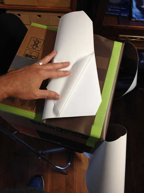 Imagen (3) muestra el proceso de separar el adhesivo del papel de soporte antes de aplicar a la superficie de la caja plana. Yo utilice un jalador de plástico como se utilizaría para la aplicación de vinilo para vidrio para expulsar el aire por debajo de la superficie moviéndose lentamente de un lado a otro. Crea una burbuja de aire debajo de la superficie y se ve mal. También puede usar su mano o un trapo con presión constante sólo asegúrese de trabajar de lado a la otra empuja el aire hacia fuera a medida que avanza.