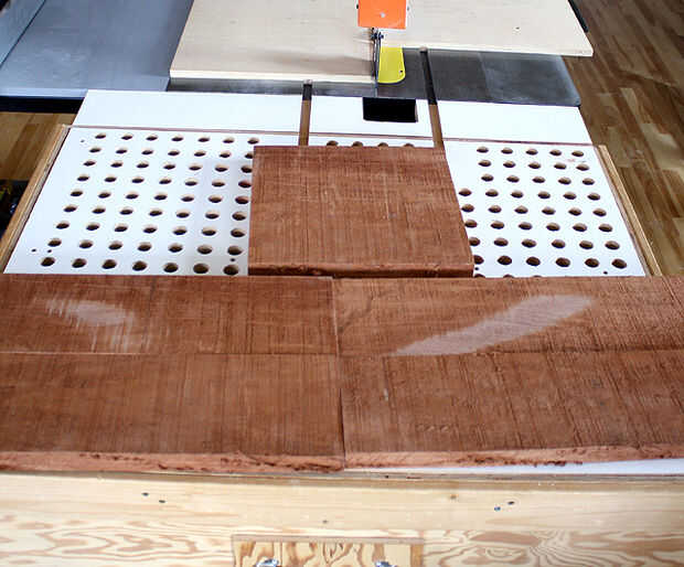 Vista de los espacios en blanco más o menos preparados para las tapas y lados de las cajas de la joyería. La madera en esta serie de cajas de joyería es caoba. Caoba cuenta con un patrón que se enclavija de grano que puede presentar un desafío al usar herramientas de mano. Preparar placas ásperas para una serie de cajas de joyería me permite seleccionar mejor el patrón del grano más atractivo para los lados y la parte superior. La estética de la caja de la joyería es tan importante como la calidad de la construcción. Puedes ver eso skip-preparación de las placas permiten el subyacente color más claro de la madera fresca para ser visto antes de que ha sido expuesto a la luz.