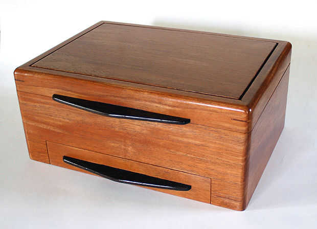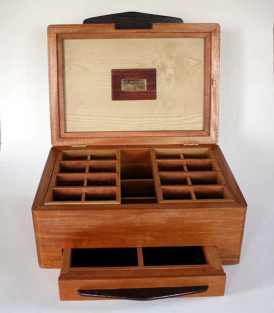 Otra variante de la caja de la joyería. Se trata de un joyero de caoba con una tapa levantada sólida. Cliente optó no tener máquina de marca instalada. Algunos clientes como él, otros prefieren que la placa de latón grabada siendo el punto focal del interior tapa de la caja. Estos cofres son bastante grandes en 14. W x 10. D x 6 en. H. de investigaciones anteriores, los clientes prefieren este tamaño. Esta caja de joyería tiene un acabado de laca spray aplicado a ambos mantener la claridad de la madera y para crear un artículo fuera acabado. Otras opciones son un acabado de goma laca y un acabado a base de aceite. Por lo general se aplica el acabado a base de aceite a la versión de nogal de la caja de la joyería. Cada uno de los cajones y bandejas han alineado ahora con terciopelo acolchada. Las cajas de la joyería siguen crearse a este día en el diseño de la montaña blanca en pequeños lotes. Crear los lotes se mantiene un par de veces al año para asegurar un inventario.