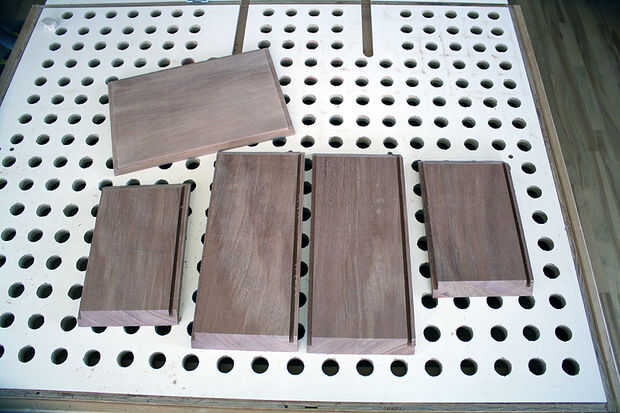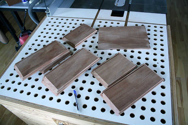 A continuación se preparan los lados y parte superior de la caja sí mismo. Ranuras y rebajos se crean utilizando plantillas para diseño. También pueden ver los extremos a inglete de los lados. Tiras de refuerzo se añadirá más tarde para reforzar las esquinas a inglete. Otra versión de la caja de la joyería ha ocultado tiras para reforzar las esquinas a inglete. Las dimensiones de los cuatro lados son cortadas con precisión para asegurar que los ingletes encajan perfectamente y el cuadro sigue siendo Plaza de arriba a abajo.