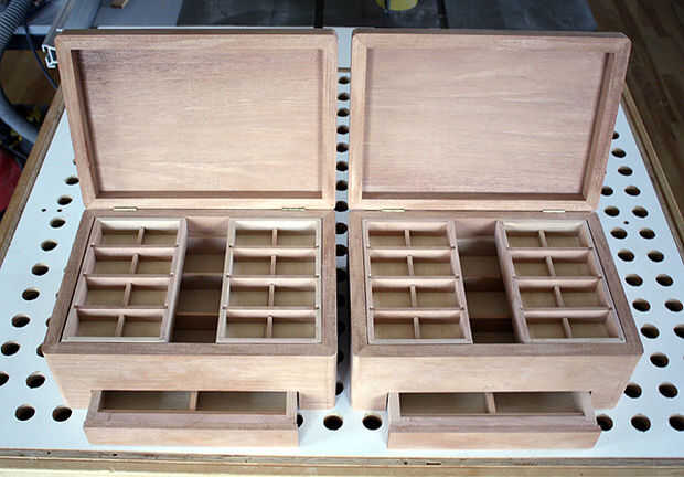 Dos vistas de una pequeña serie de cajas de joyas que han sido equipados con cajones y bandejas. Las asas madera tallada a mano las contrastantes luego equipadas para la tapa y el cajón de la caja de la joyería. Se convierte en fundamental para seguir una secuencia de montaje predeterminado para mantener cierta eficiencia en la producción de estas cajas de joyas. Tienen los mangos tallados preparados antes de mano.