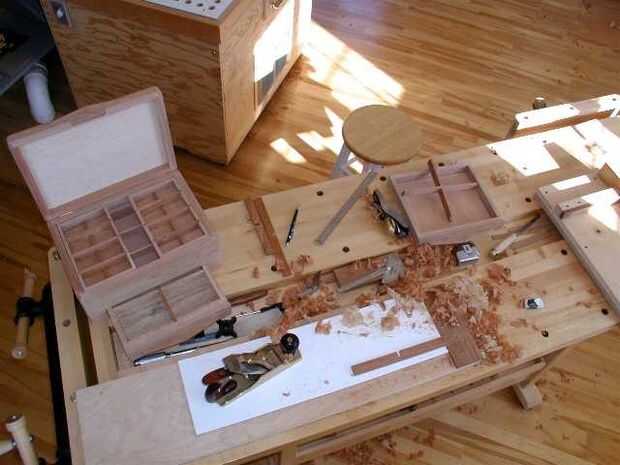 Una vista aérea de montaje proceso, los componentes individuales del interior de la caja de la joyería son mano cepillada a la tolerancia. Aunque varios componentes se pueden intercambiar entre cajas de la joyería, el objetivo es asegurar que cada componente se incorpora a un joyero particular.