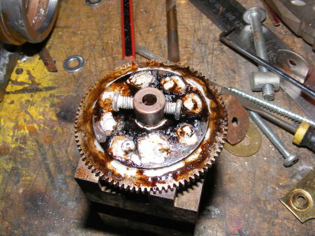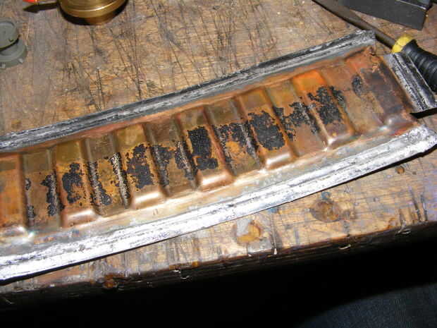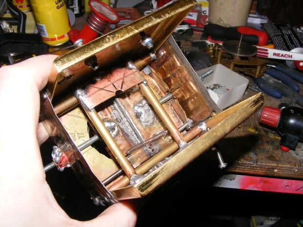 martilleando más material para hacer los lados y cortar algo de placa decorativa latón bandeja para hacer la parte de atrás, lo de la placa tenía un borde solderd en que vino en práctico para hacer los bordes se superponen proporcionando un sello de luz. doblado de placas de espejo y una tuerca de mariposa Agárrate la parte posterior. pernos bloqueo las bobinas en lugar de las clavijas de la unidad