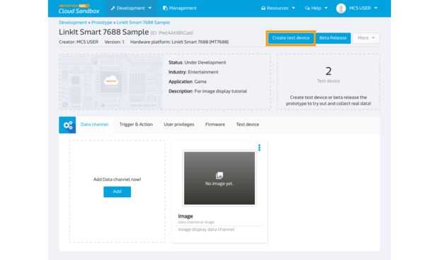 Después de agregar el canal de datos, ahora crear un dispositivo de prueba. Esta prueba es igual que la placa de desarrollo. Cuando se conecta la placa de desarrollo a MCS, usted puede recibido datos procedentes de la Junta de desarrollo y también dar comando al dispositivo así.