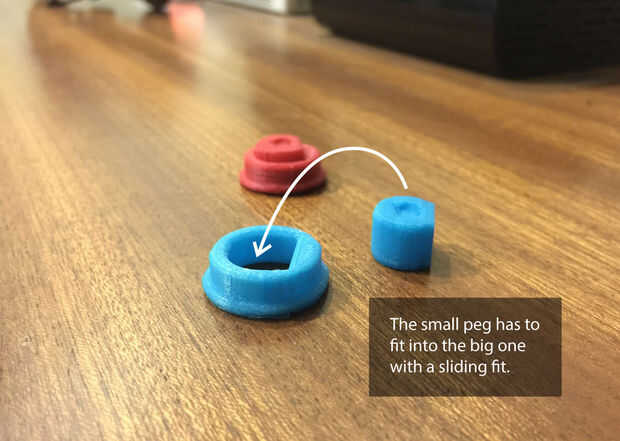 Imprimir el archivo calibration_puck en la carpeta "Calibrado" con un relleno de 15% y sin soportes/balsas. La idea es conseguir las dos partes del duende malicioso para caber junto con un ajuste descrito en términos de ingeniería entre "apretado" y "desplazamiento" y deben ser capaces de encajar en cualquiera de los dos extremos. Este paso requiere que usted a meterse con un par de ajustes de la máquina de cortar (caudal / Diámetro del filamento). Una vez que se imprime el primer duende malicioso, intentar encajan entre sí y buscan los siguientes resultados