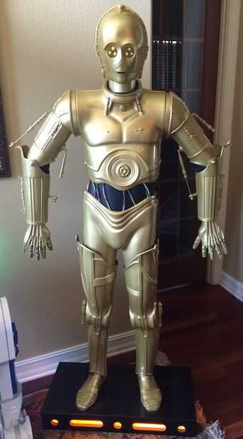 El droide C3PO es un pedazo de pantalla que hice que está parado sobre una base iluminada. El droide es controlado por Arduino dos