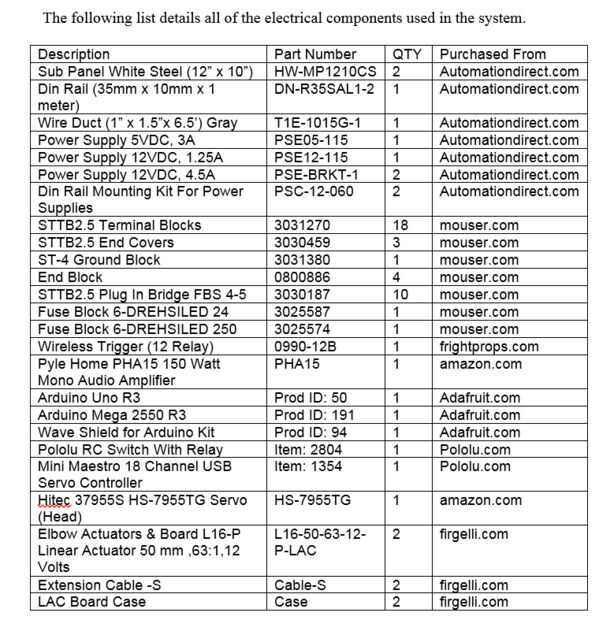 Los componentes eléctricos están montados en dos sub-paneles acero blanco en el torso. Los materiales utilizados para el montaje eléctrico se enumeran aquí.
