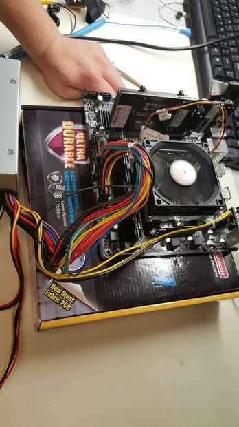 Hay dos pernos etiquetado como poder al lado de la usb. Si se conectan usando un destornillador o algún otro conductor comenzará la placa base. Su ventilador de calor y ventilador de tarjeta gráfica comenzará a girar, y si tienes un cable VGA conectado, se mostrará un visual en el monitor. Debe decir que no haya un dispositivo de arranque.