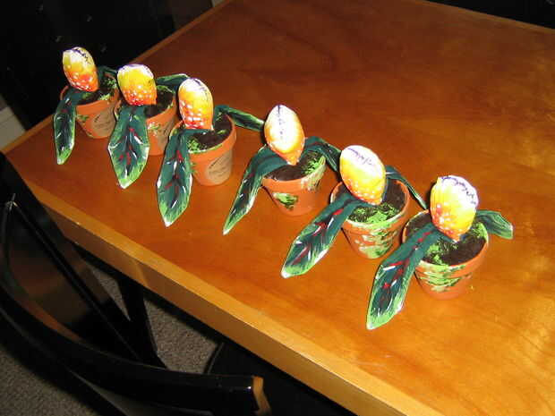 Con el piezas completas, un poco caliente derretimiento pegamento es todo lo que se necesita para montar las yemas. Primero las hojas se pegan a las vainas, una a cada lado. Luego presionando la vaina y las hojas firmemente en un charco de pegamento en el bote, todo está conectado y listo para ir.
