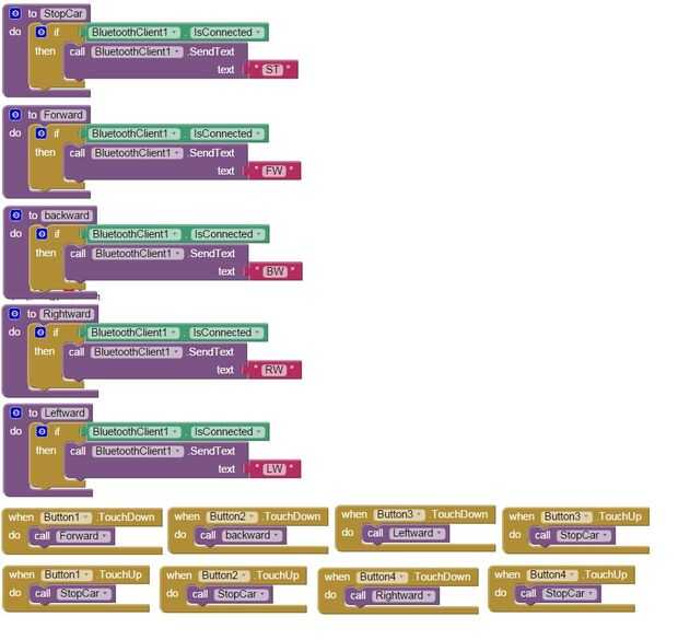 以上的程式當按下APP上的上下左右的按鈕時, 在藍芽以連線的狀態下會送出 "文字命令"像 "ST","FW", "BW", "RW","LW", 這些是純文字形式你可以自己定義他們, 例如 "ST"就代表停止,"FW"代表車子往前走.這些"文字命令" 透過藍芽傳到Arduino 智慧小車端, 在Arduino的程式裡就可以做對應的控制.