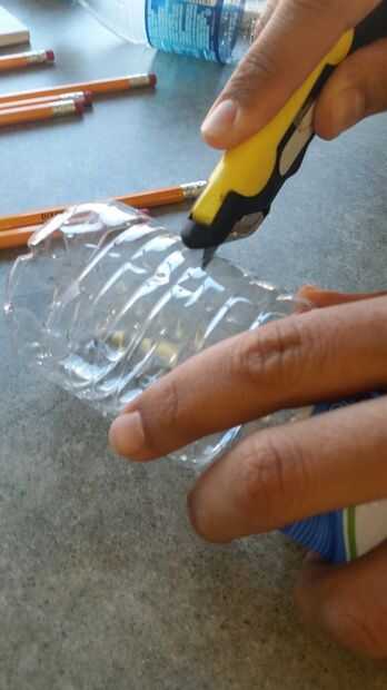 ¿Recuerda la botella de agua de los requisitos? Usted tendrá que cortar la parte inferior de la botella de agua para crear una cesta de la catapulta. Para nuestra catapulta, cortamos la cesta para ser alrededor de 2 pulgadas de profundidad.