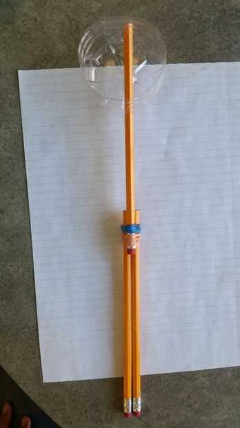 Deslice la cesta en el lápiz extendido sobre el brazo de lanzamiento. Luego, atar una banda elástica gruesa alrededor de la parte superior del lápiz. Esto actuará como un tapón para evitar que resbalen al disparar.