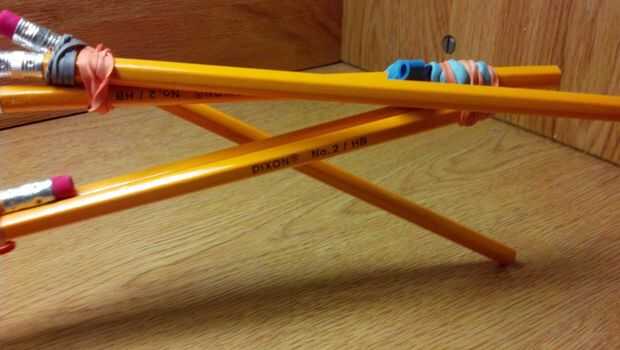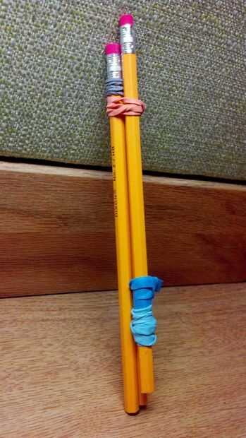 Atar una banda elástica gruesa aproximadamente 2 pulgadas desde la parte inferior del lápiz medio en la base que creamos anteriormente (esto será el lápiz con una goma alrededor de él, no dos). Ahora, en este mismo lápiz, banda de la parte inferior del brazo de disparo por debajo de la banda de caucho gruesa que atamos justo para que el brazo de disparo está apuntando hacia arriba. Esta banda debe apoyarse en la parte inferior de la abrazadera de los lápices en el brazo de disparo.