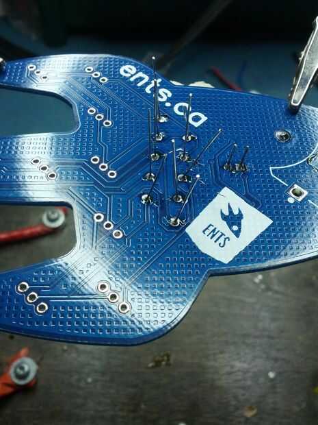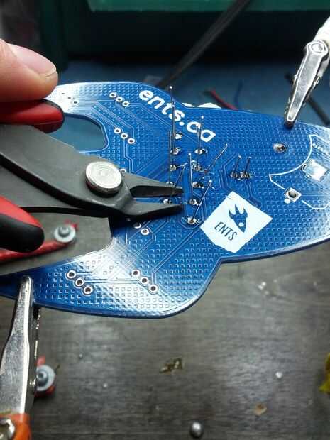 Una vez que todo está soldado, usted puede cortar todos los cables al ras con el tablero, excepto el botón y el clip de la batería. Sus conductores son pequeños y no molestan nada.