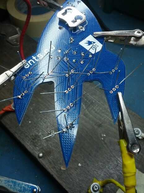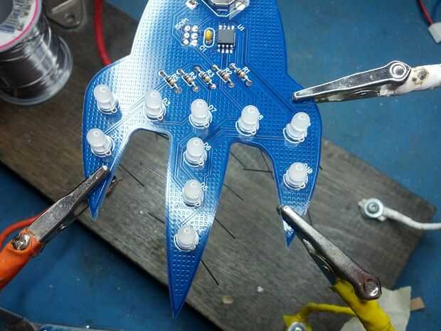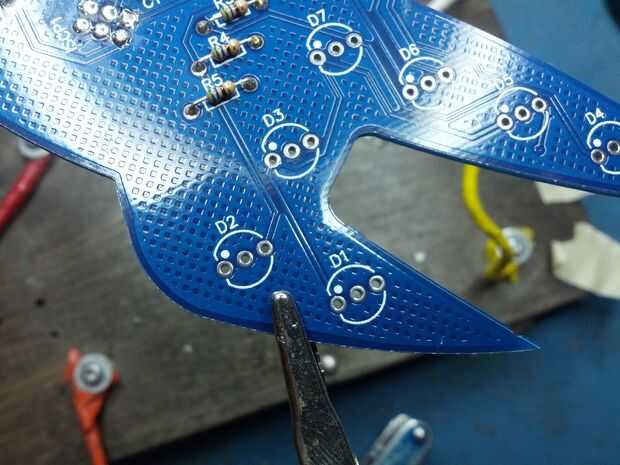 En vez de grabar los LEDs, trate de semi-""remache los cables. Cuando pones un LED, doble los dos cables exteriores para que estén a unos 45 grados. Les dejará de caer hacia fuera al soldarlos en el lugar. Puede resultarle más fácil hacerse con las puntas manteniendo el tablero boca abajo al insertar los LEDs.