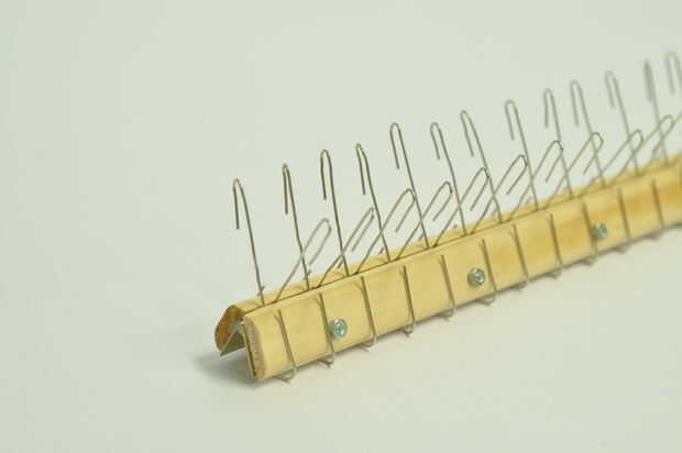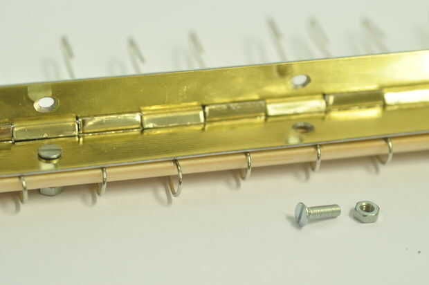 Fije la bisagra a los lados planos de las piezas de madera como se indica en las imágenes. Cuando la articulación se abre, los ganchos entrecruzan.