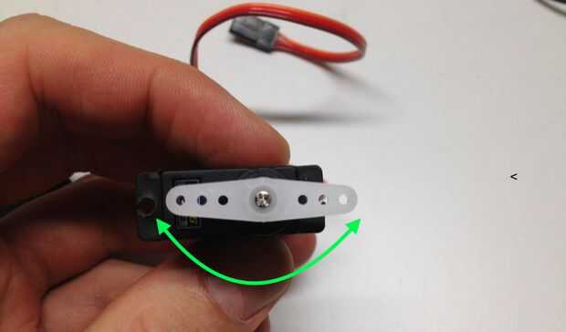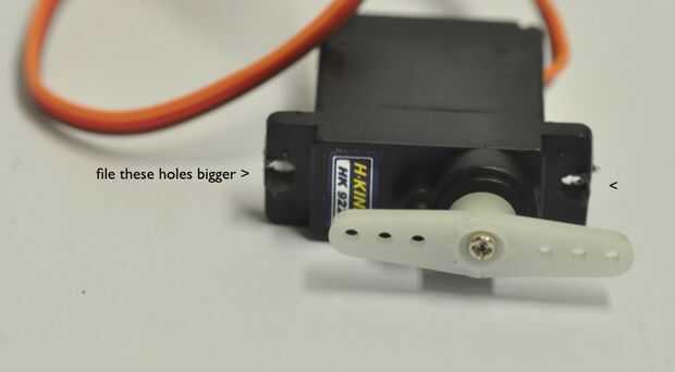 Colocar las 'alas' del motor servo, como este y fijar con el tornillo pequeño del paquete. Presentar sus orificios a ambos lados del plástico negro, que necesitan para ser un poco más. Asegúrese de que el brazo se mueve como se indica en verde.