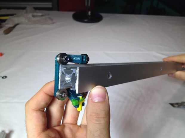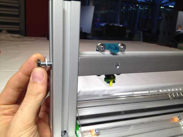 Deslice el portador de hilado a lo largo de la barra. Enganchar la barra horizontalmente entre los perfiles de aluminio corto vertical. Poner todos los tornillos de la forma, pero no los apriete todavía.