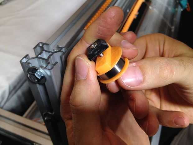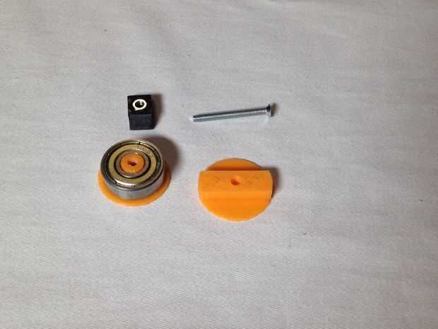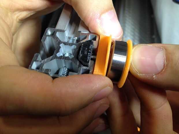 Tomar "bearing608_mount" y un 608 teniendo en forma. Tomar "3030nut" y coloque una tuerca interior. Juntar todas las piezas como se indica en la imagen, luego deslícela en el perfil vertical (corto)).