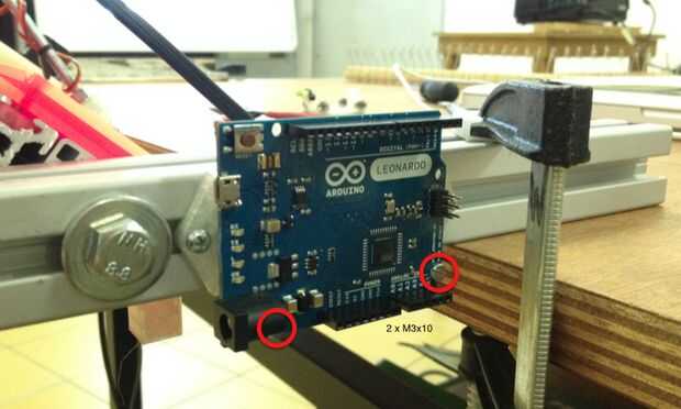 En la barra horizontal que se une a la mesa, sujete la montura de Arduino. Lugar el Arduino con un par de tornillos.