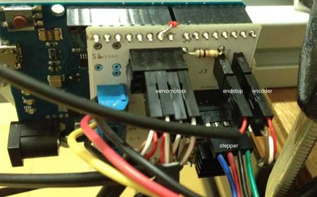 Conectar el resto de los cables como en la imagen: 4 servomotores, 1 codificador, 1 tope y paso a 1 paso.