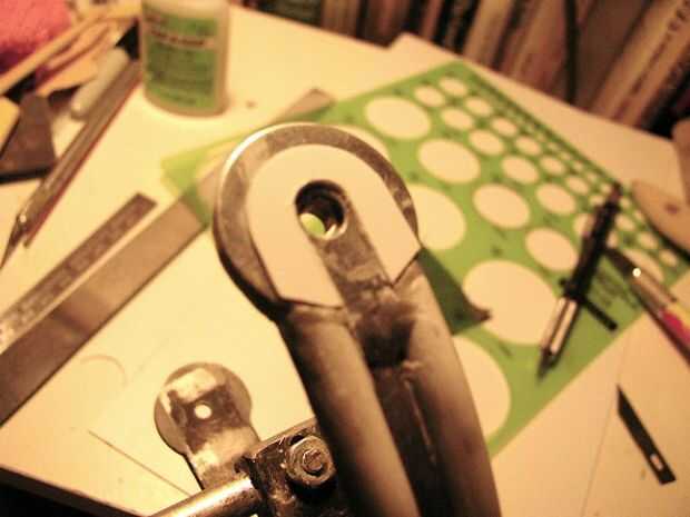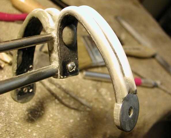 Con las piezas de la horquilla recién doblada atornilladas a la barra del buffer y metalico barra, ellos podrían fleshed hacia fuera para ver bien carnosos. Primero fue una simple arandela, rellena con Apoxie.