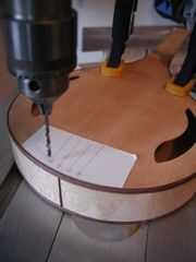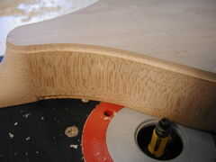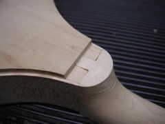 A diferencia de la mayoría de botones que he visto, esta se extiende más allá del extremo del cuello y en la parte superior de los lados. Esto es debido a la sección del talón muy corto del cuello. El botón parecía extrañamente proporcionado me he apoyado fuera tan sólo cubriría la parte superior del cuello. Solía cinceles a mano alzada para eliminar la madera de la zona botón y suavizar y aplanar la superficie final para el botón de aceptar.