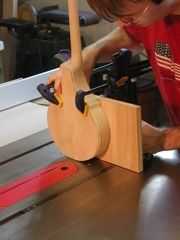 Corté la ranura para la cola ajuste le tapa la junta entre las dos mitades de los lados en la tabla VI. He usado un aparejo que rápidamente fue improvisado con un pedazo de madera contrachapada atornilló en un calibrador de inglete y luego fijada directamente al cuerpo de la mandolina. Un paso en la Sierra de mesa fue suficiente para hacer la ranura ancha de 1/8 pulgadas.
