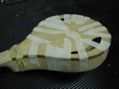 El atascamiento del extremo de la cola fue pegado con pegamento para madera y sujeta con cinta adhesiva se seque. Había lijado el exceso con la lijadora de husillo otra vez.