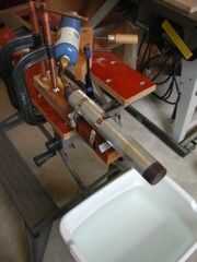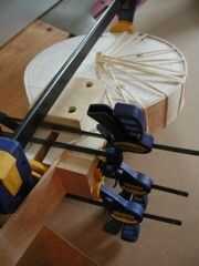 Asegurado los lados sobre el formulario para secar y enfriar. Esto era mucho más fácil con el sistema de espiga centro utilicé. Le permite ser fácilmente un trabajo de una persona para asegurar los lados en lugar de utilizar bandas de goma grandes se extendía por todo el cuerpo. Este método tuvo al menos dos personas, una para sostener el lateral y la otra para estirar la goma. Con la espiga del centro y algunas pequeñas bandas de goma, pude tengo el lado en el lugar con una mano y estira las gomas sobre la parte superior de la clavija, alrededor de la costilla y entonces sobre las clavijas del otro extremo que sobresale de la parte inferior de las formas. He usado gomas pequeños, ligeros, pero los más pesados pueden ser más apropiados dependiendo de cuán cerca sus curvas son a la forma de la forma. Con las gomas que utiliza, incluso con un buen número, todavía tenía que usar un caul y abrazaderas para asegurar los extremos de los lados donde hay curvas muy cerradas que no podía tensar las gomas. Usé el pedazo que había corte del bloque de cabeza en la misma zona puesto que ya era la forma correcta. También añadí una pinza hacia abajo en el centro para sostener el extremo de la cola firmemente al bloque de cola. Utilizar la misma configuración de sujeción más adelante para el encolado de los lados de los bloques.