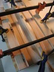 Hice el refuerzo común del centro de una pieza de esta mandolina y pegadas sobre el primer uso de una abrazadera en extremo y en un conjunto de apoyos de madera utilizados para sujetar la media posición de la rodillera. Luego recortados y pegados sobre los soportes transversales otra vez usando una tabla para mantener todo plano mientras el pegamento seca. Los extremos de las abrazaderas laterales fueron tallados hacia abajo usando una escofina de madera.