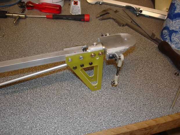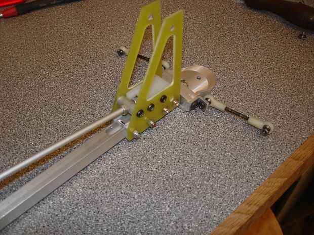 Se atornillan los soportes para las barras de la pelota terminada en los soportes de ángulo recto pequeño fijados a la placa del motor, y se atornille directamente una palanca palanca reciprocante en el servo. Las barras de vinieron de una aventura anterior en coches de rasguño construido radio controlada y son ajustables para la longitud.