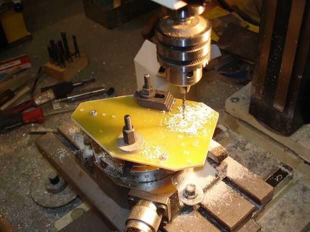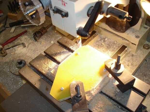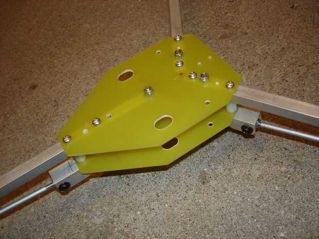 Decidí hacer el diseño para que los brazos están a 120 grados entre sí. Para asegurarse de que estén correctamente colocados, me sujeta las placas de fibra de vidrio superior e inferior con tornillos y mecanizados de forma general en el molino. Luego montar las placas a mi mesa giratoria y perforado los agujeros exactamente la perpendicular.
