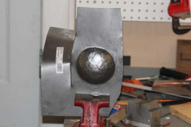 Abrir el tornillo del diámetro que quieras la cámara, coloque la sangría dentro de la mordaza, y empezar a golpear con el martillo otra vez. Trabajo en un área, gira lentamente la pieza, para que acaben con un círculo perfecto.