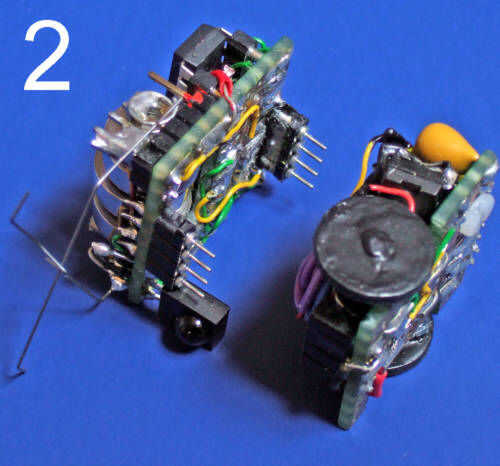Me gusta usar construcción de cubierta para los robots de verdad pequeños. Ver foto 2. Esto consiste en dos mitades que junto con. 1" tira encabezados y zócalos. Esto da acceso fácil a todos los componentes, haciéndolo más fácil de depurar los circuitos o realizar cambios.