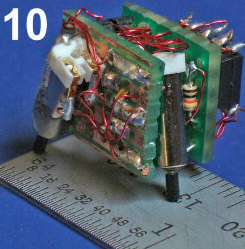 Después de hacer un robot de una pulgada cúbica que funcionaba, tenía que probar algo más pequeño. Yo estoy buscando un robot alrededor de 1/3 de pulgada cúbica. En este punto, Sr. cubo de dos es aproximadamente.56" x. 58" x.72 ". Cuenta con un microcontrolador Picaxe 08 que le permitirá moverse de forma autónoma. Foto 10 muestra el robot en una regla. Foto 11 muestra el otro lado del robot en un cuarto. Las dos baterías son baterías de litio 3 v cr1220 y queda por ver si tienen capacidad suficiente para alimentar los motores y el Picaxe. Pueden necesitarse más baterías.
