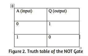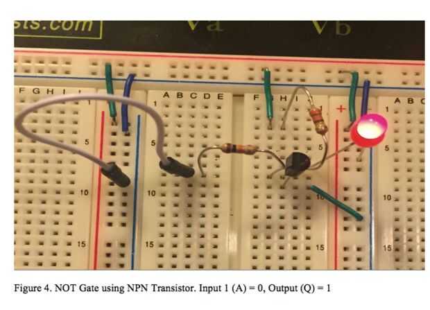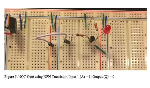 La puerta deseada es la puerta no (inversor), y su símbolo y tabla de verdad se muestran en las figuras 1 y 2 respectivamente. La configuración de resistencia-Transitor Logic (RTL) para el inversor se muestra en la figura 3, y fue construido en un protoboard para propósitos de prueba. También, vamos a probar las dos entradas posibles y observar sus salidas correspondientes, para garantizar que RTL construido es de hecho correcto. La salida se observó utilizando un detector de circuito del LED. Si el LED está encendido, la salida es High (1). Si el LED está apagado, la salida es Low (0). Finalmente, mirando la salida del circuito construido y la tabla de verdad puerta no, podemos concluir que la configuración de circuito RTL es en efecto correcta.