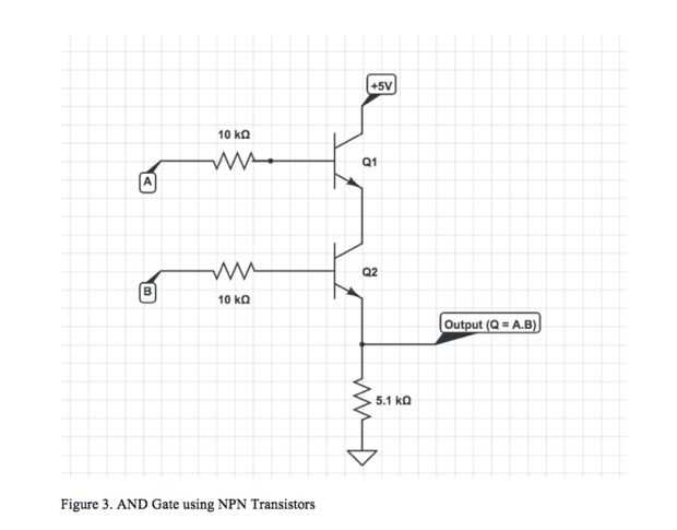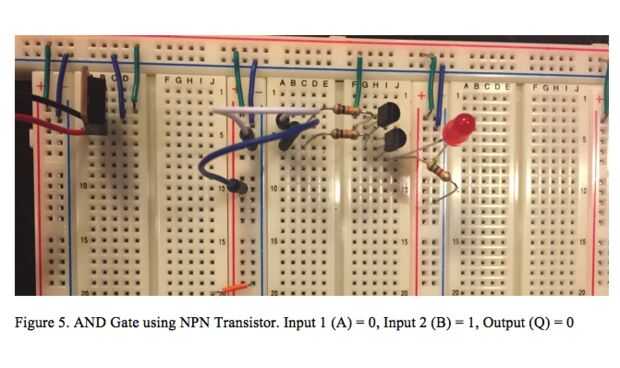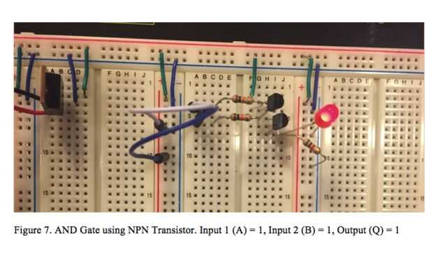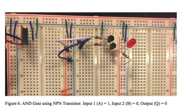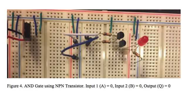 La puerta deseada es la puerta y, y su símbolo y tabla de verdad se muestran en las figuras 1 y 2 respectivamente. La resistencia-Transitor Logic (RTL) para el inversor se muestra en la figura 3, y fue construido en un protoboard para observar los resultados. También, vamos a probar las cuatro entradas posibles y observar sus salidas correspondientes, para garantizar que RTL construido es de hecho correcto. Para la parte del tablero, entrada 1 (A) está representado por el cable blanco, entrada 2 (B) está representado por el hilo azul y la salida está representada por el estado del LED (encendido o apagado). Si el LED está encendido, la salida es High (1). Si el LED está apagado, la salida es Low (0). Finalmente, mirando la salida del circuito construido y la tabla de verdad puerta AND, podemos concluir que la configuración de circuito RTL es en efecto correcta.